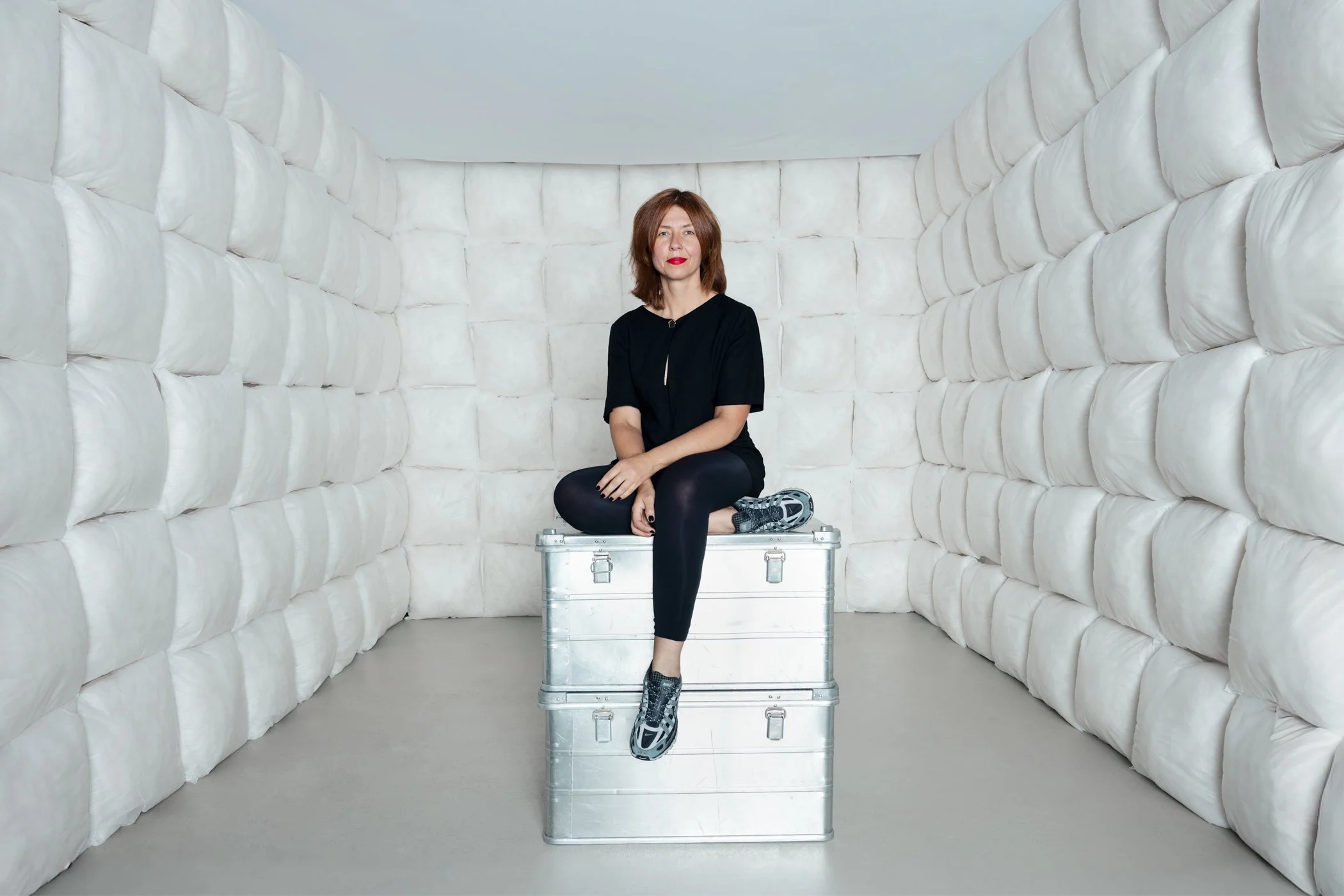 Bei diesem Auftrag habe ich mich riesig darüber gefreut, zwei inszenierte Räume entwickeln zu dürfen, die nicht nur Bühne waren, sondern die Atmosphäre für ihre Kollektion geschaffen haben. Der weiße Raum bestand aus 138 Kissen, die dicht an dicht an den Wänden befestigt wurden – weich, monumental, fast surreal. Der schwarze Raum auch reduziert, klar, hier mit Neonröhren, die in einer Flucht zusammenliefen, wie eine Landungsspur, die den Blick lenkt und die Spannung zwischen Licht und Dunkelheit spürbar macht.Und niemand hätte ihre Designs besser präsentieren können als sie selbst. Es war entscheidend, dass Ingnahl in ihren eigenen Stücken steht. Nur sie konnte die Liebe nach dem Tod ins Hier und Jetzt tragen – unverstellt, unmittelbar, von einer Intensität, die kein anderes Model hätte verkörpern können. Genau darin lag die Kraft dieser Arbeit.